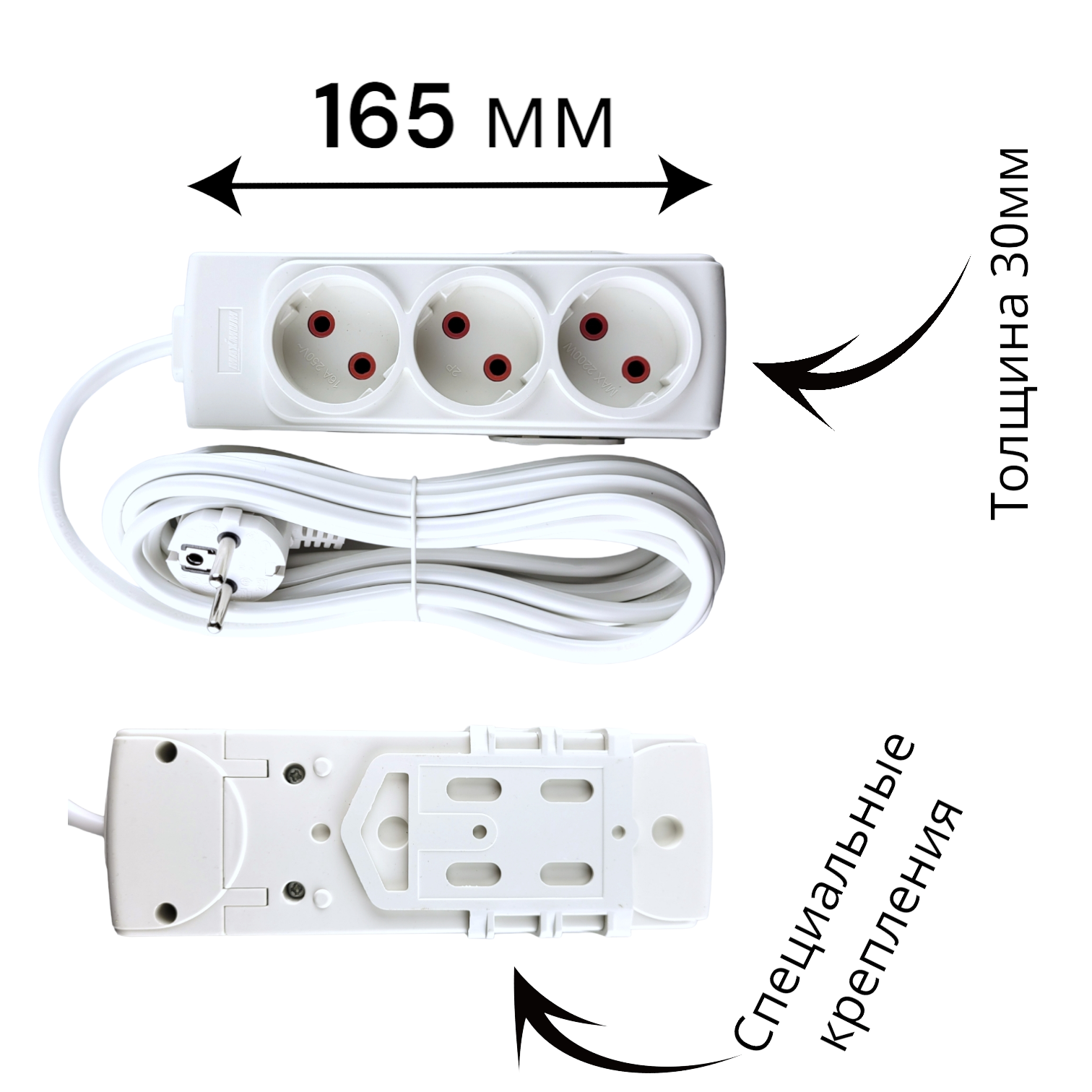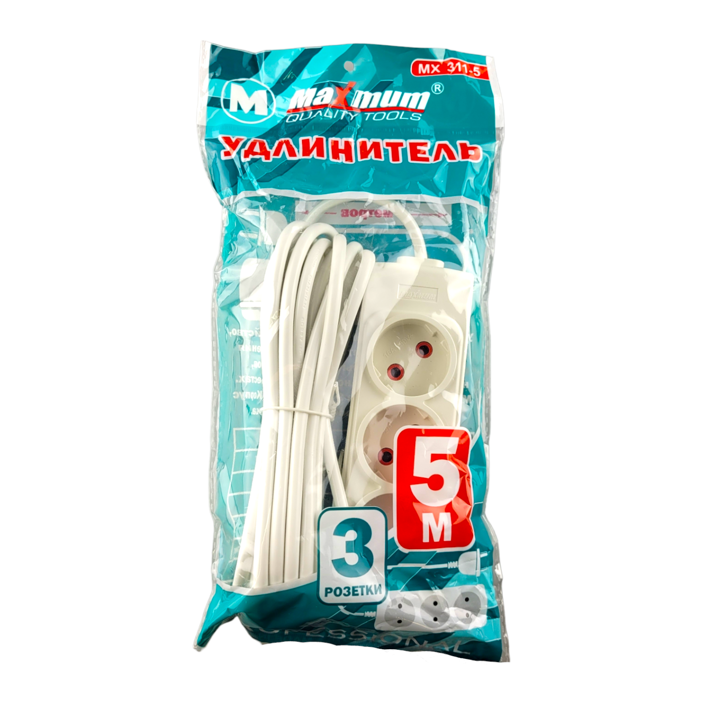 Сетевой электрический удлинитель 5 метров от "MAXIMUM QUALITY TOOLS" имеет 3 розетки на подключение к сети переменного тока. Белый корпус из негорючего АБС-пластика подходит для использования только внутри помещений.