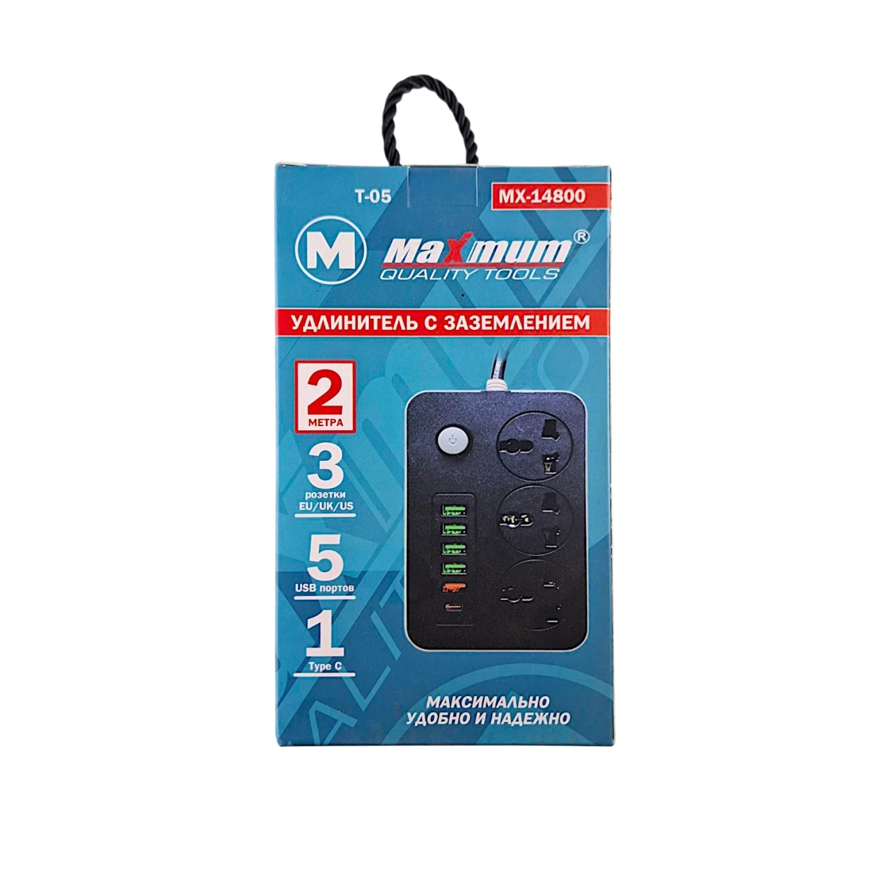 Удлинитель сетевой черный с бепроводной зарядкой 3 метра, 3 евро розетки, 4 USB порта, Type C, 2500W