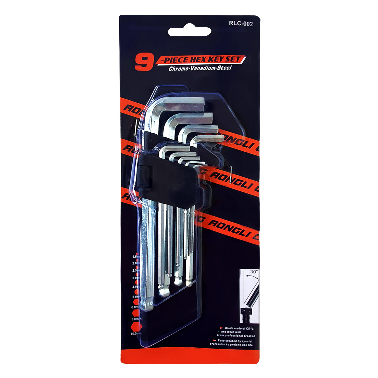 Набор состоит из 9-ти шестигранных ключей 1,5-10 мм с шаровидным наконечником, предназначенных для работы с винтами, имеющими шлиц в форме внутреннего шестигранника HEX.