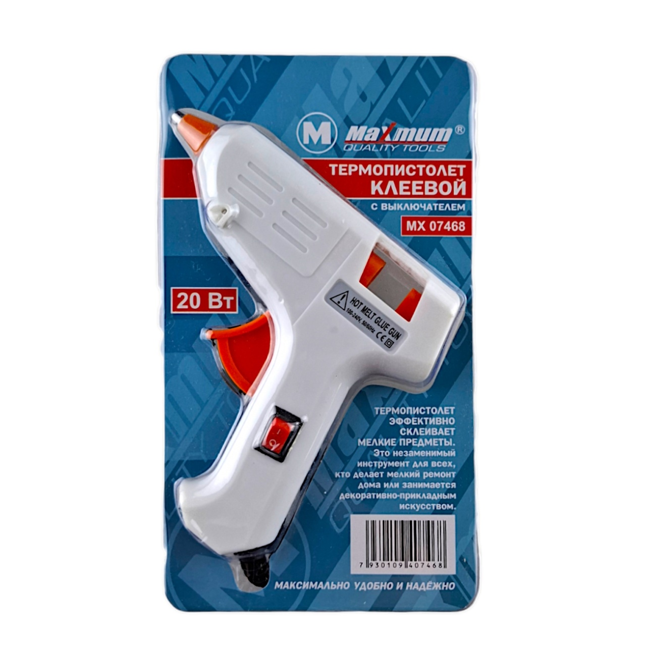 Клеевой пистолет с кнопкой выключения изготовлен из термостойкого пластика - способен работать с предметами из любых материалов: дерево, ткань, камень, стекло, металл, пластик.