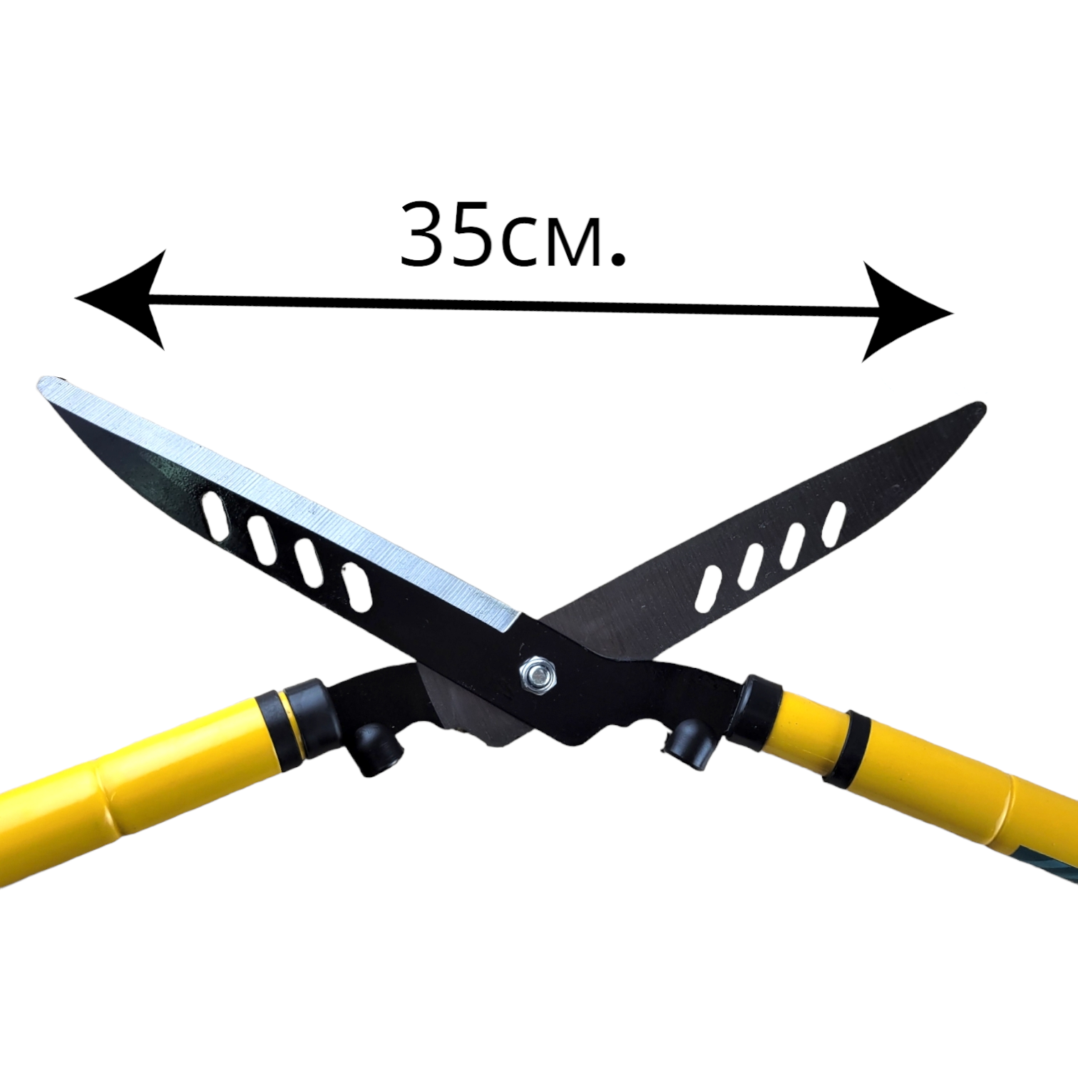 Садовые ножницы с телескопическими ручками раздвигающимися от 55 до 73 см имеют лезвие длиной 20 см, которое раскрывается до 35 см. Лезвие кусторезов выполнено из прочной стали с антикоррозийным покрытием.