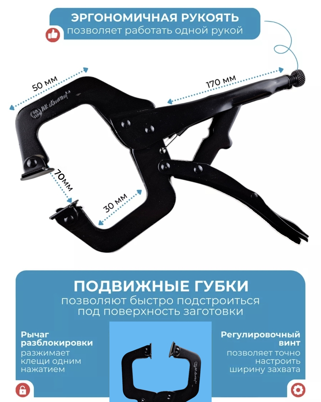 · Надежная фиксация "третья рука": Позволяет прочно удерживать детали и заготовки в заданном положении, освобождая обе руки для работы. Нажав на рычаг Вы мгновенно осуществите разжим.