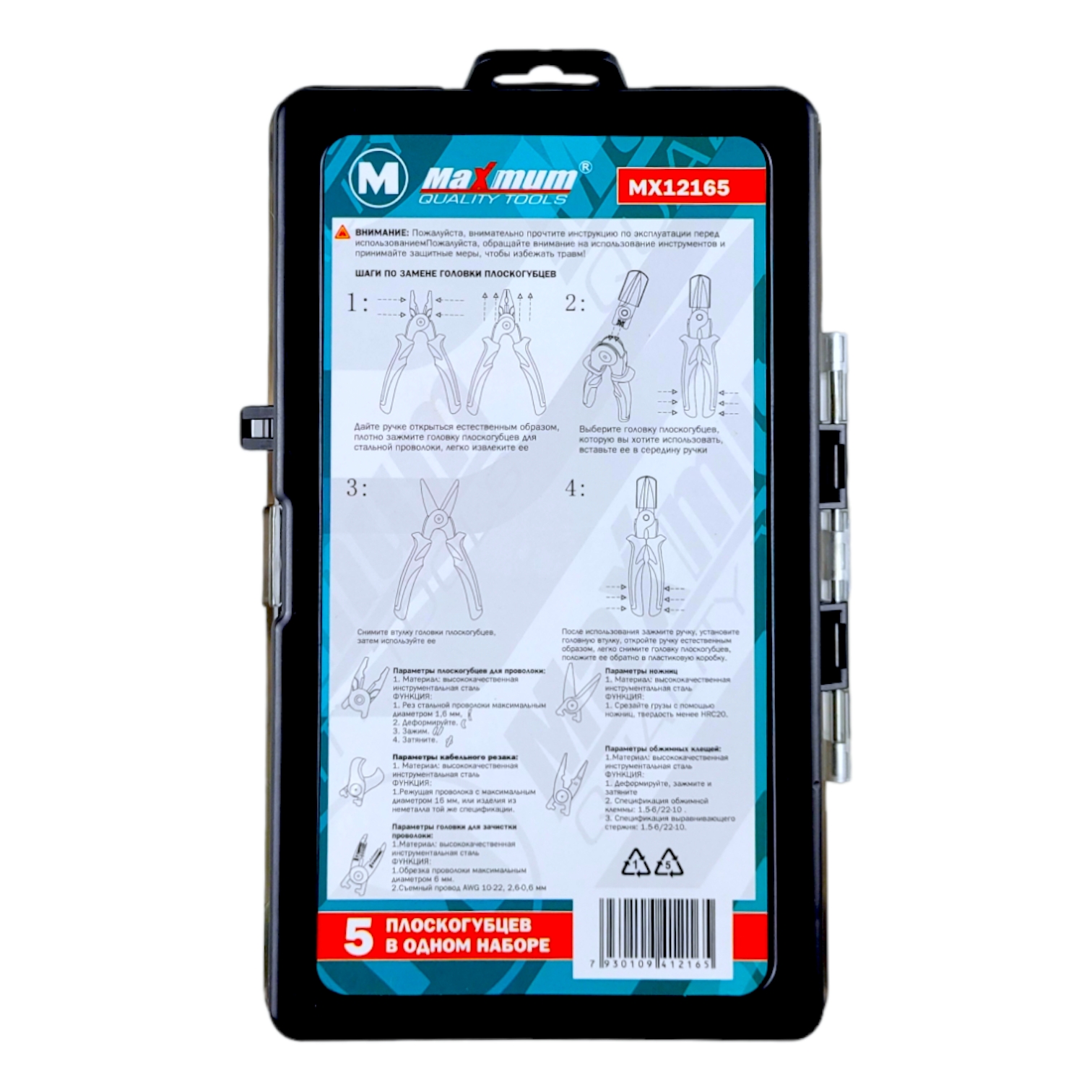 Набор шарнирно-губцевых инструментов CRV 5 в 1 от бренда "Maximum Quality Tools" - это удобные рукоятки со съемной переставной рабочей частью. Многофункциональные сменные плоскогубцы для электриков выполнены из высококачественной стали и имеют маркировку для удобного подбора необходимой рабочей части. Подходят для различных задач: перекусывание, откручивание, зачистка и обжим проводов.