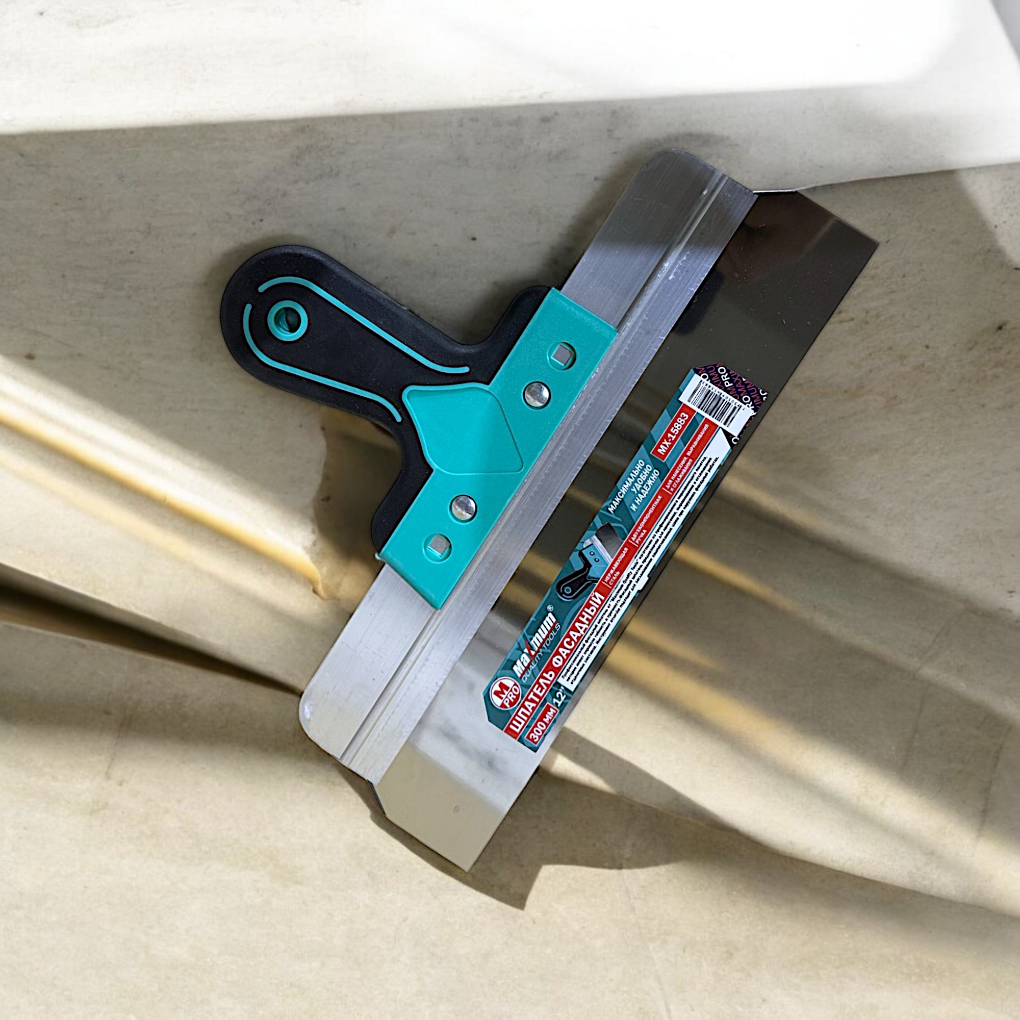Фасадный шпатель с алюминиевой направляющей 300 мм подходит для нанесения штукатурки, шпаклевки и других строительных смесей на большие поверхности.