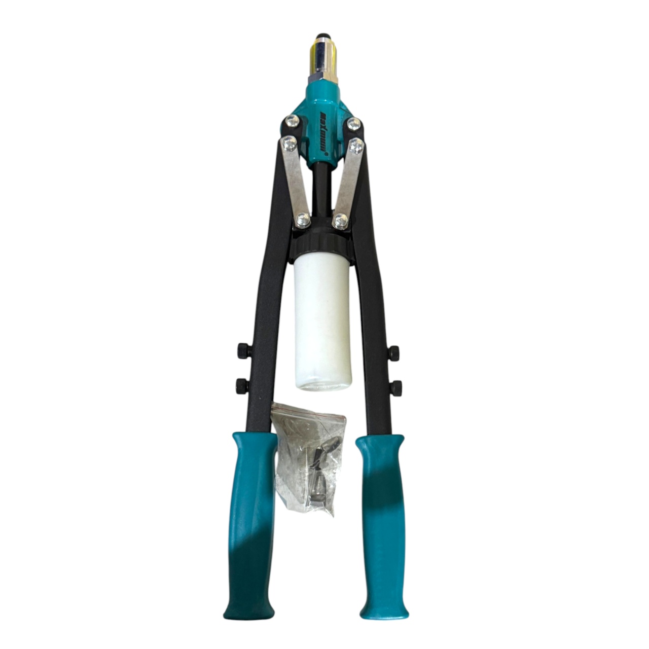 Специальный механизм - мультипликатор, позволяет снизить усилие, необходимое для установки заклёпки. Инструмент идеально подойдёт для установки заклёпок, как в помещении, так и на открытом воздухе. В комплект поставки входит вся необходимая оснастка для установки заклёпок размером от М3 до М8. В случае необходимости, вы можете приобрести запасные резьбовые штоки. Кроме того, заклёпочник двуручный можно доукомплектовать оснасткой для установки заклёпок-болтов размером от М5 до М8.