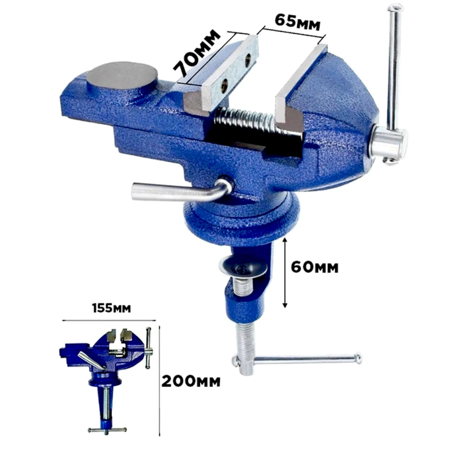 Тиски слесарные 70 мм оснащены механизмом подвижной губки и поворотной основой 0°-360°, которая позволяет обрабатывать детали с разных сторон. Ширина накладок (губок) 70 мм.