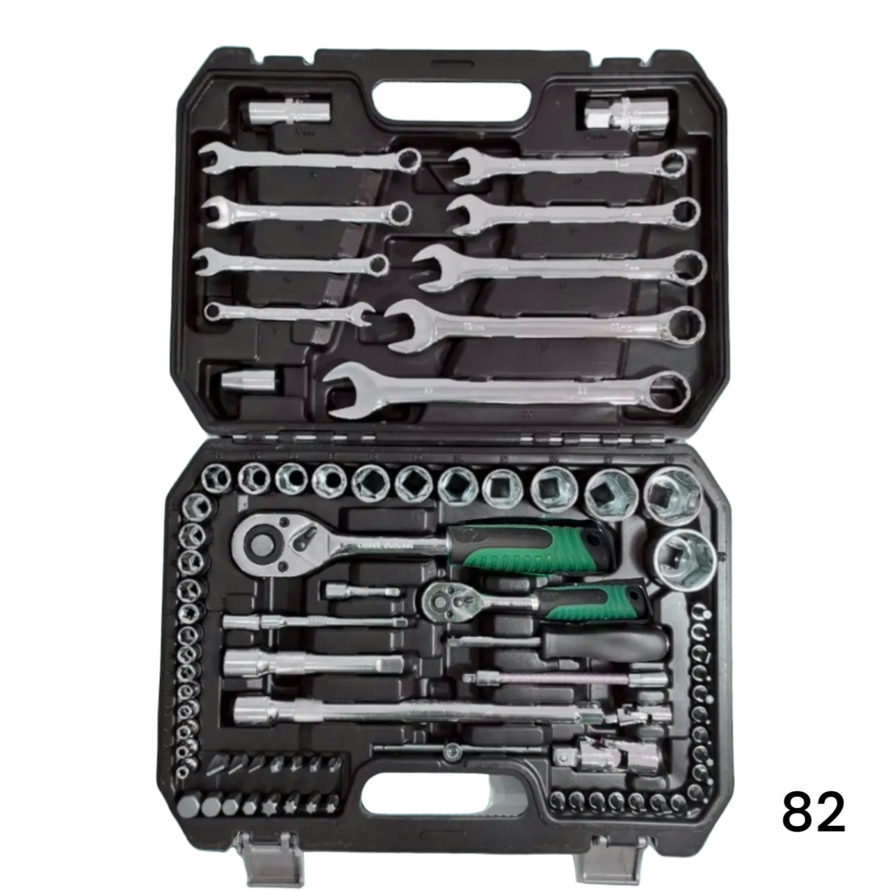 Универсальный набор инструментов с 12-гр. головками 1/2"DR и 1/4"DR используется в автомастерских для работ с различными видами крепежа. Набор состоит из 82 предметов, на каждом из которых стоит маркировка с размером. Набор выполнен из высокопрочной стали, на поверхность инструментов нанесено хромованадиевое покрытие, которое придает изделиям высокую коррозионную стойкость и механическую прочность. Для надежного хвата и комфортной работы ключи-трещотки оснащены удобными двухкомпонентными рукоятками. Набор инструментов для авто поставляется в кейсе из ударопрочного пластика, что гарантирует безопасное хранение и транспортировку. Инструменты внутри кейса компактно расположены и надежно закреплены. Специальная застежка предотвращает выпадение инструментов из кейса. Комплектация набора представлена на фото 4.