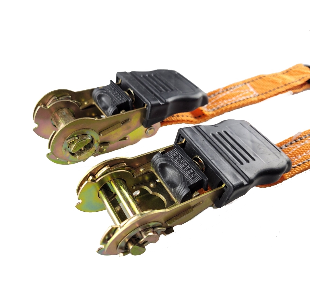 Ремни для крепления груза с храповым механизмом и крюками созданы для фиксации багажа и крепления небольших грузов (коробки, мебель и т.д.) к верхнему или прицепному багажнику легкового автомобиля, фургона и других транспортных средств. Прочная лента из полипропиленовых нитей двойного плетения не деформирует фиксируемый груз и имеет относительное удлинение не более 7 % при максимально допустимой рабочей нагрузке. Храповик стяжного багажного ремня имеет пластиковое покрытие и оснащен удобным механизмом разблокировки. Надежный зубчатый механизм предотвращает ослабление натяжения ремня во время движения транспорта. Крюки и храповый механизм выполнены из прочной стали.