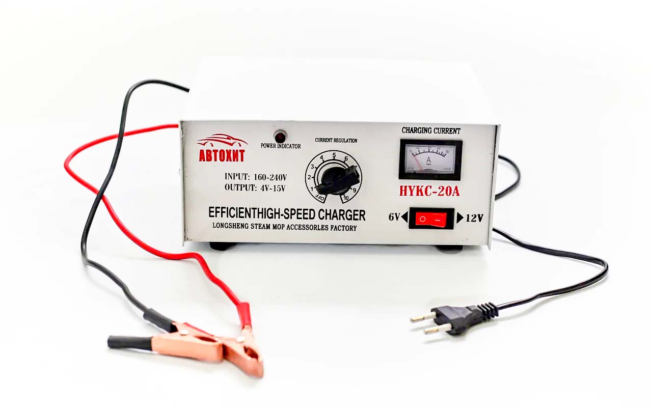 Зарядно-предпусковое устройство для автомобильного аккумулятора АвтоХит 20 А предназначено для зарядки свинцово-кислотных аккумуляторов напряжением 6,12 В. На передней панели устройства расположены ступенчатый регулятор интенсивности заряда, амперметр, вольтметр и переключатель напряжения. На задней панели расположен предохранитель.