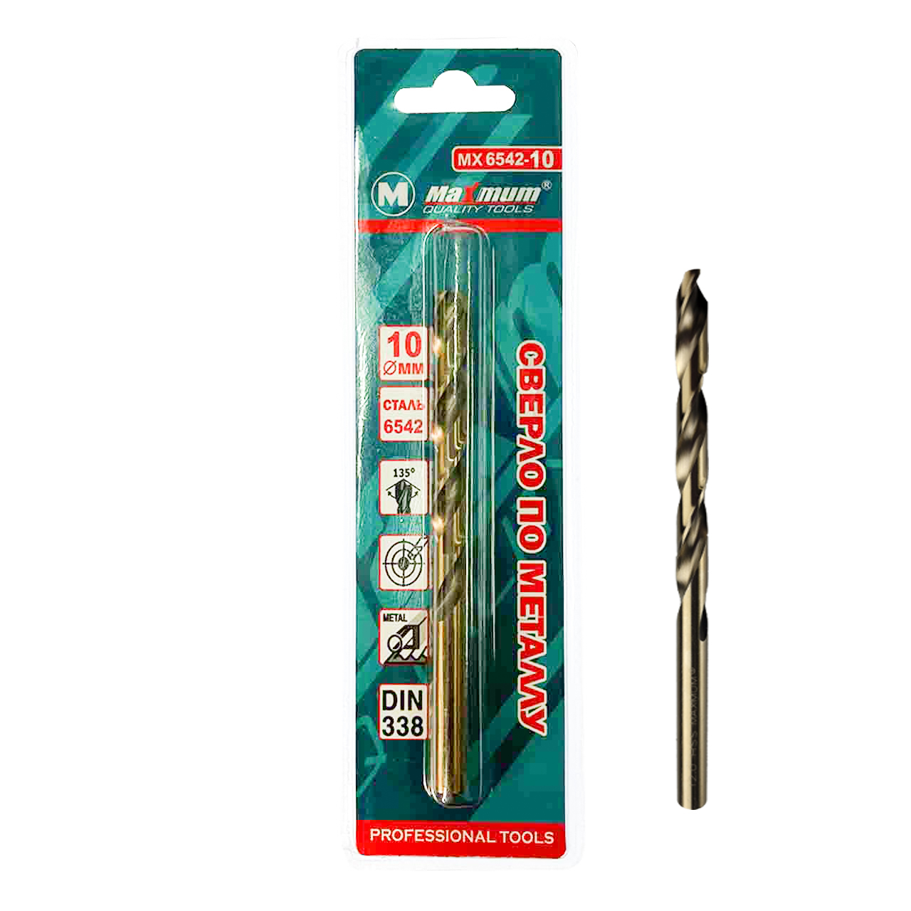 Сверло HSS 10 мм из стали 6542 с титановым покрытием предназначено для обработки металла и представляет собой витой стержень с остро заточенными двойными режущими кромками.