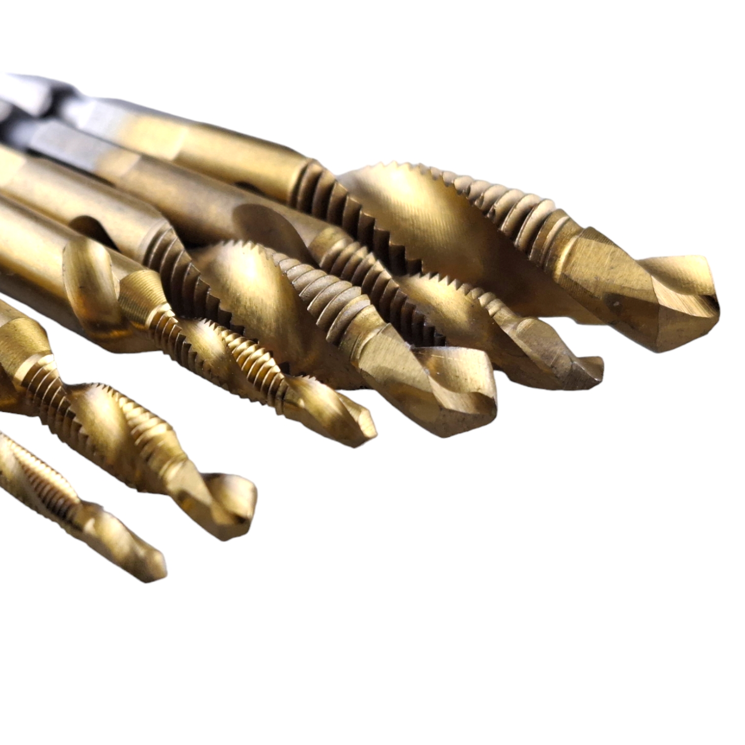 Набор комбинированных титановых сверл предназначен для нарезания резьбы, удаления заусенцев и зенковку по различным материалам: меди, дереву, латуни, алюминию, листовому металлу, пластику и т.п.