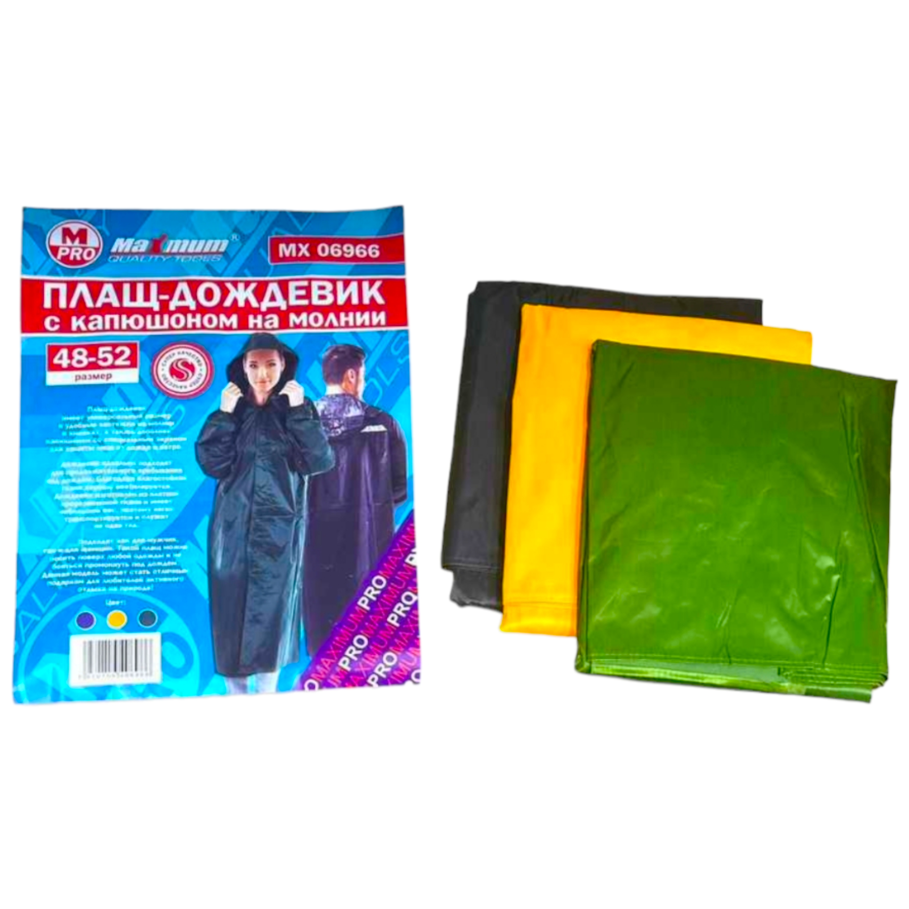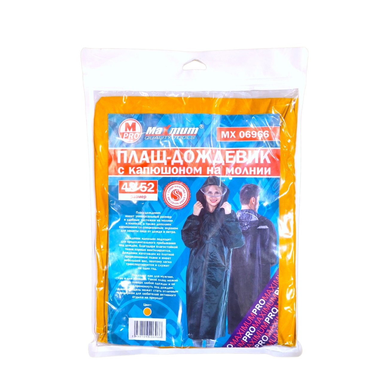 Плащ-дождевик имеет универсальный размер и удобные застежки на молнии и кнопках, а также дополнен капюшоном со специальным экраном для защиты лица от дождя и ветра.